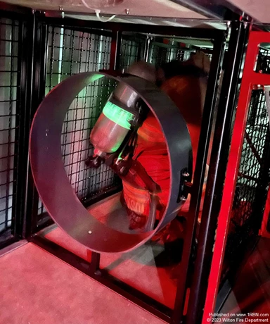 The Wilton Fire Department with the New Canaan Fire Department completed four days of SCBA (air pack) confidence training evolutions, March 13th through the 17th. All four shifts from both departments rotated through the Connecticut Fire Academy SCBA trailer (staged at St. Luke's School in New Canaan) in full turnout gear and air packs, working through low profile, low air and entanglement scenarios. Wilton and New Canaan respond to many fires together as part of written mutual aid compacts. As such, this joint training event, although difficult logistically, was worth the effort.