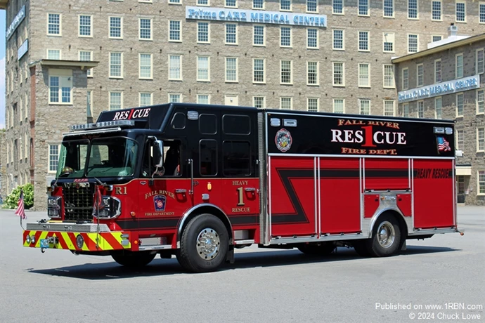 Fall River Rescue 1 operates with a 2018 Spartan Gladiator / EVI walk-through heavy rescue. This newer apparatus replaced a tired 1993 International / Ranger.