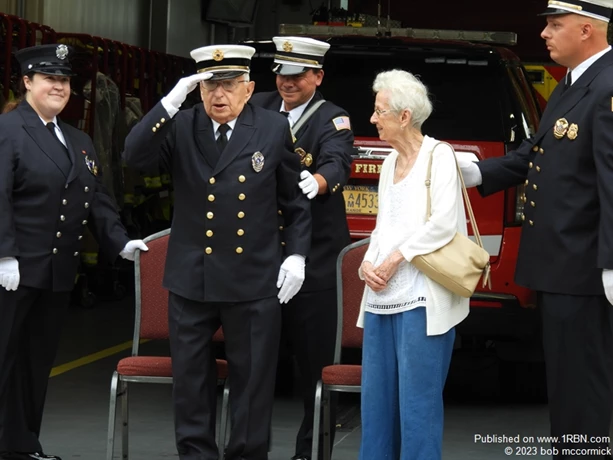 Assistant Chief Chris Wilson escorted Mrs. D'Angelo to her seat, and Chief of the Department Tom Van Zandt walked Pat down between the members who stood saluting. Pat gave them back a salute. After the ceremony, Pat was given his helmet and past chief's badge, plus the company presented him with a plaque for his 67-years of service.