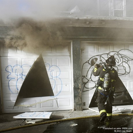 First due companies found heavy smoke banked down in the street and a working fire in a six-bay garage at 337 Maple Street. The multiple-bay garage was also attached to a large two-and-a-half story house. A second-alarm was transmitted, bringing additional fire companies to the scene.