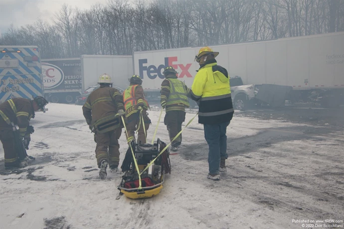While en route, crews were notified of a working fire with explosions and several people reportedly entrapped, and arrived to find a tractor-trailer and other vehicles well involved. Command quickly began to call for extra equipment and tankers to help fight the stubborn fire. Eventually, command had a ladder truck dispatched to help extinguish the fire from above due to crews not being able to get as close because of the many wrecked vehicles.