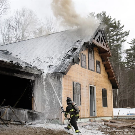 TILTON, NH - Early on Friday morning, April 7th, a fire tore through a home under constuction on Stonehege Circle. First arriving Franklin and Tilton firefighters found the garage in between the two condo units fully involved with heavy fire.