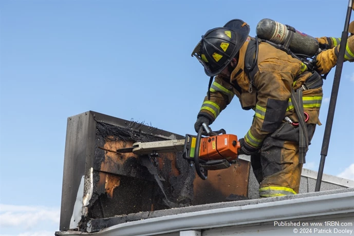 Squad 441 was the first apparatus to arrive and laid LDH from a nearby hydrant and supplied a crew with an interior attack line. Tower 541 arrived and set up for roof operations. Roof crews opened up the adjacent roof areas to limit the fire spread.