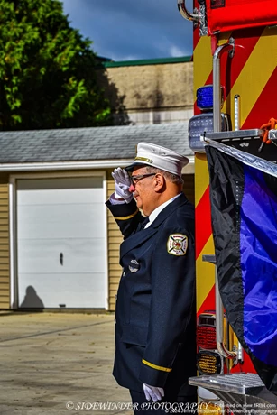 Photo by Jeffrey Belschwinder/ Sidewinder PhotographyFirefighters saluting Asst. Chief David Plew as the funeral rig passes by the Brunswick No.1 fire station.