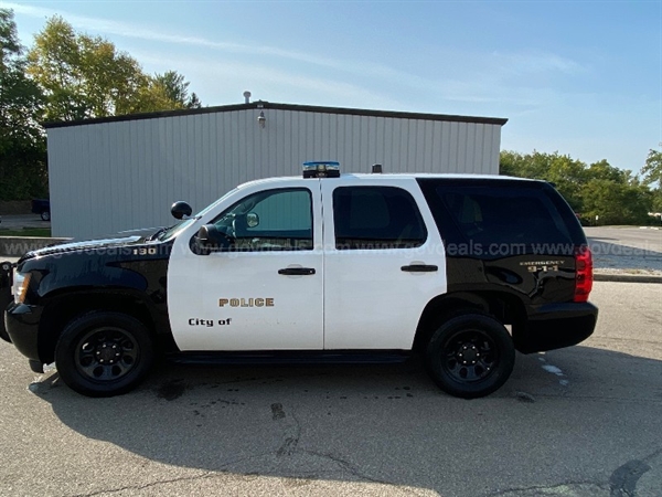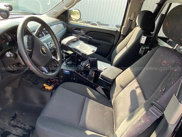 2013 Chevrolet Tahoe Police SPORT UTILITY 4-DR, 5.3L V8 OHV 16V FFV. Jump start, runs, is drivable. Minor scratches, tires have all hubcaps but poor tread. No cracked windows. Interior has damage from simulation training, but should clean off easily. Exposed wires. Police package, dual airbags, AM/FM. Maintenance schedule is every 5,000 miles. A/C, cruise, tilt, power windows, power door locks, power seats, remote mirrors, climate control. Gamber Johnson Dockstation, L3 video Code 3 lgiht bar, all Blue Proguard seats.
